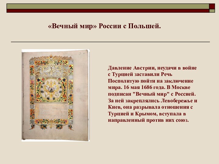 года. В Москве подписан "Вечный мир" с Россией. За ней закреплялись Левобережье и Киев, она разрывала отношения с Турцией и Крымом, вступала в направленный против них союз.