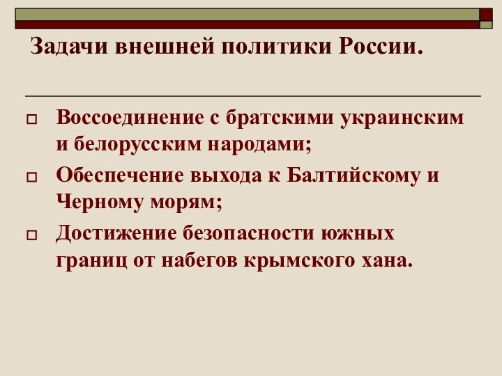 Задачи внешней политики России. Воссоединение с братскими украинским и белорусским народами;Обеспечение выхода к Балтийскому и Черному морям;Достижение безопасности южных границ от набегов крымского хана.