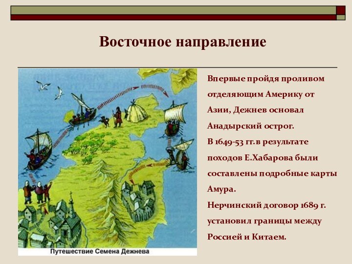 Впервые пройдя проливом отделяющим Америку от Азии, Дежнев основал Анадырский острог.В