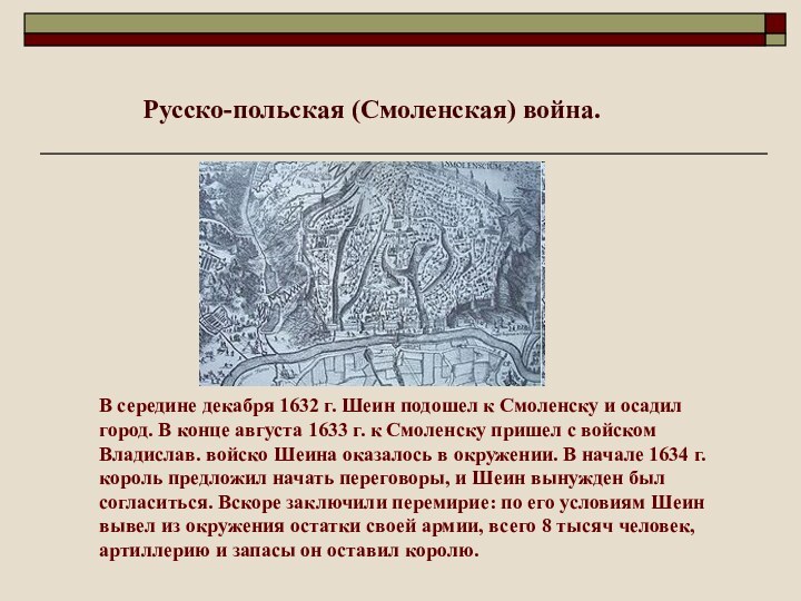 к Смолен­ску пришел с войском Владислав. войско Шеина оказалось в окружении. В начале 1634 г. король предложил начать переговоры, и Шеин вынужден был согласиться. Вскоре заключили перемирие: по его условиям Шеин вывел из окружения остатки своей армии, всего 8 тысяч человек, артиллерию и запасы он оставил королю.