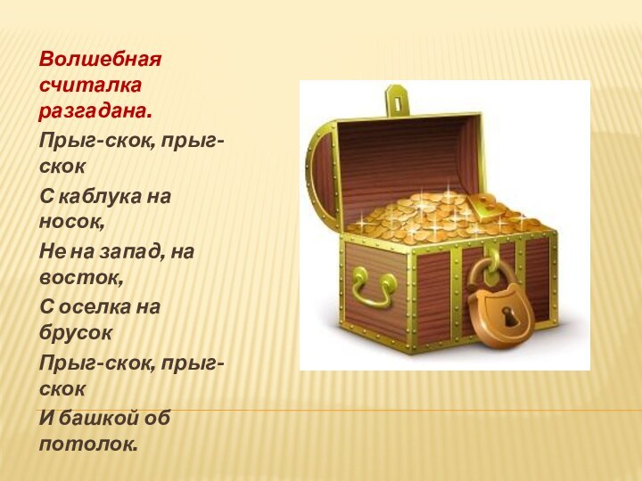 Волшебная считалка разгадана.Прыг-скок, прыг-скокС каблука на носок,Не на запад, на восток,С