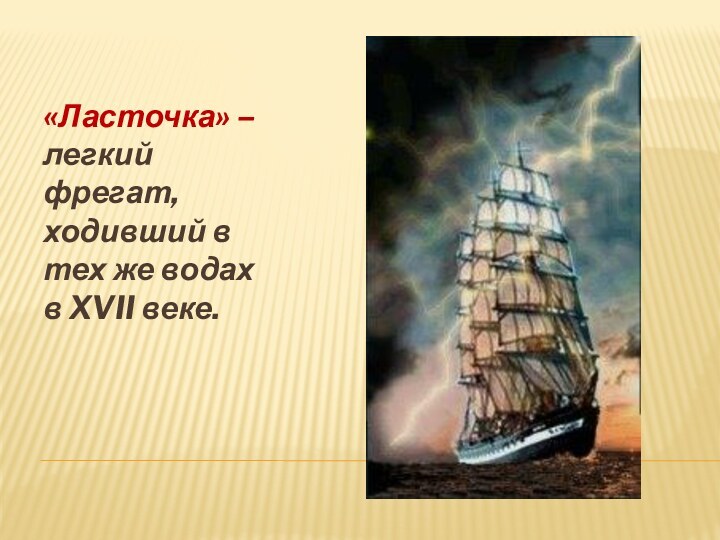 «Ласточка» – легкий фрегат, ходивший в тех же водах в XVII веке.