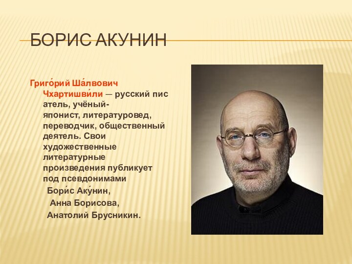 Борис АкунинГриго́рий Ша́лвович Чхартишви́ли — русский писатель, учёный-японист, литературовед,  переводчик, общественный деятель. Свои художественные литературные произведения публикует под псевдонимами  Бори́с Аку́нин,  Анна Борисова, Анатолий Брусникин.