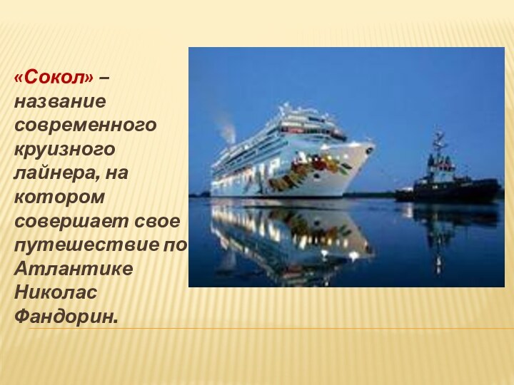 «Сокол» – название современного круизного лайнера, на котором совершает свое путешествие по Атлантике Николас Фандорин.