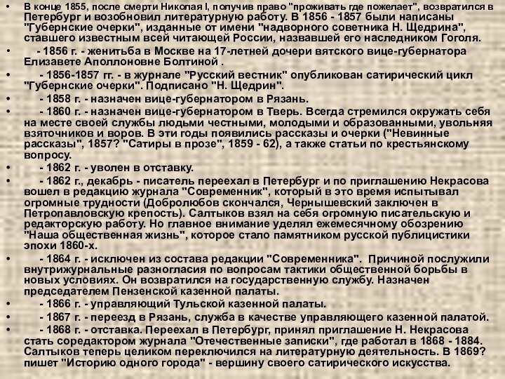 - 1860 г. - назначен вице-губернатором в Тверь. Всегда стремился окружать себя на месте своей службы людьми честными, молодыми и образованными, увольняя взяточников и воров. В эти годы появились рассказы и очерки ("Невинные рассказы", 1857? "Сатиры в прозе", 1859 - 62), а также статьи по крестьянскому вопросу.