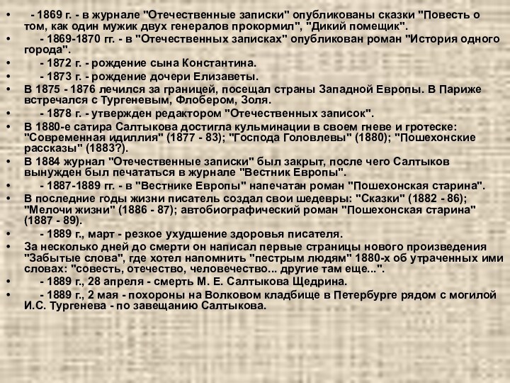 - 1869-1870 гг. - в "Отечественных записках" опубликован роман "История одного города".