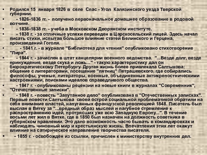 - 1848 г. - повесть "Запутанное дело" опубликована в "Отечественных записках". Первые повести Салтыкова своей острой социальной проблематикой обратили на себя внимание властей, напуганных французской революцией 1848. Писатель был выслан в Вятку за "...вредный образ мыслей и пагубное стремление к распространению идей, протрясших уже всю Западную Европу...". В течение восьми лет жил в Вятке, где в 1850 был назначен на должность советника в губернском правлении. Это дало возможность часто бывать в командировках и наблюдать чиновный мир и крестьянскую жизнь. Впечатления этих лет окажут влияние на сатирическое направление творчества писателя.