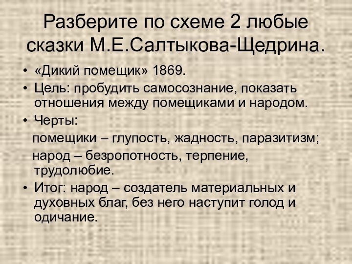 Разберите по схеме 2 любые сказки М.Е.Салтыкова-Щедрина.«Дикий помещик» 1869.Цель: пробудить самосознание,