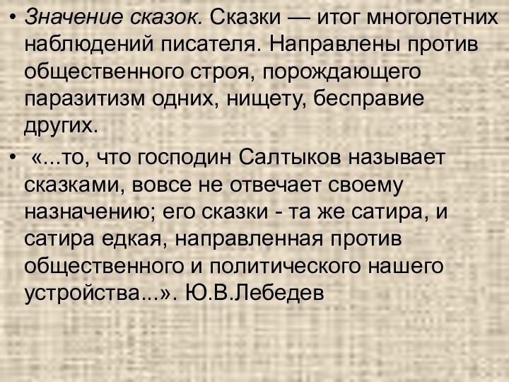 «...то, что господин Салтыков называет сказками, вовсе не отвечает своему назначению; его сказки - та же сатира, и сатира едкая, направленная против общественного и политического нашего устройства...». Ю.В.Лебедев