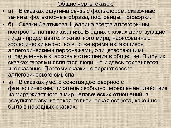 Общие черты сказок:а)	В сказках ощутима связь с фольклором: сказочные зачины, фольклорные