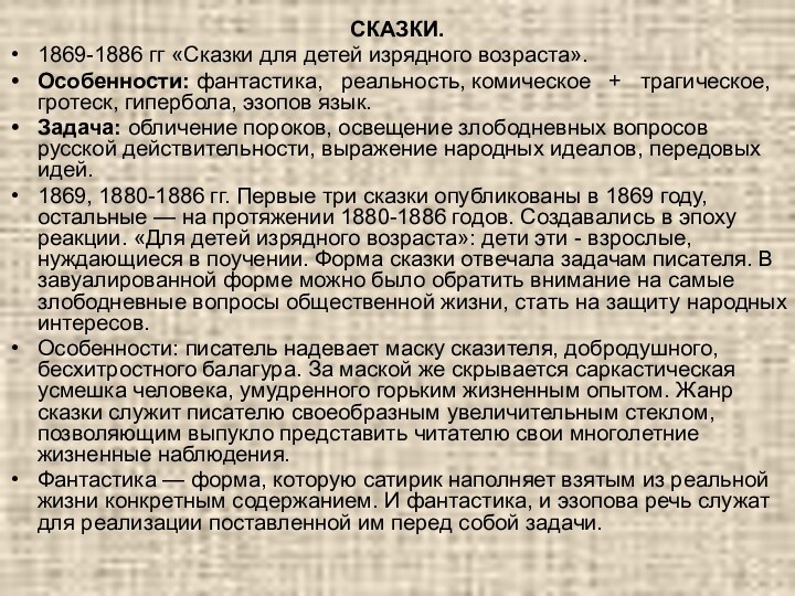 СКАЗКИ.1869-1886 гг «Сказки для детей изрядного возраста».Особенности: фантастика, реальность, комическое +