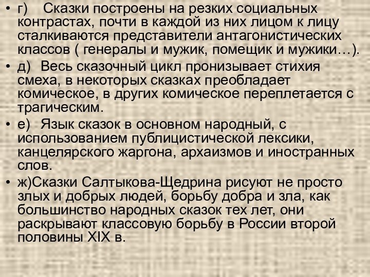 ж)Сказки Салтыкова-Щедрина рисуют не просто злых и добрых людей, борьбу добра и зла, как большинство народных сказок тех лет, они раскрывают классовую борьбу в России второй половины XIX в.