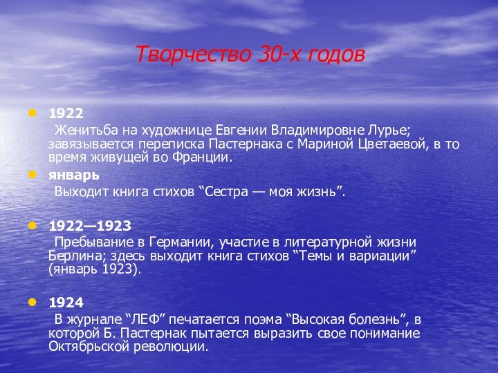 Творчество 30-х годов1922	Женитьба на художнице Евгении Владимировне Лурье; завязывается переписка Пастернака