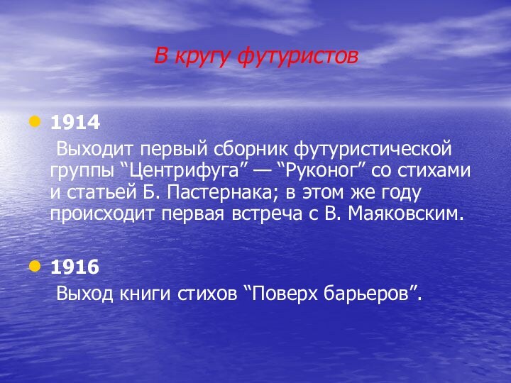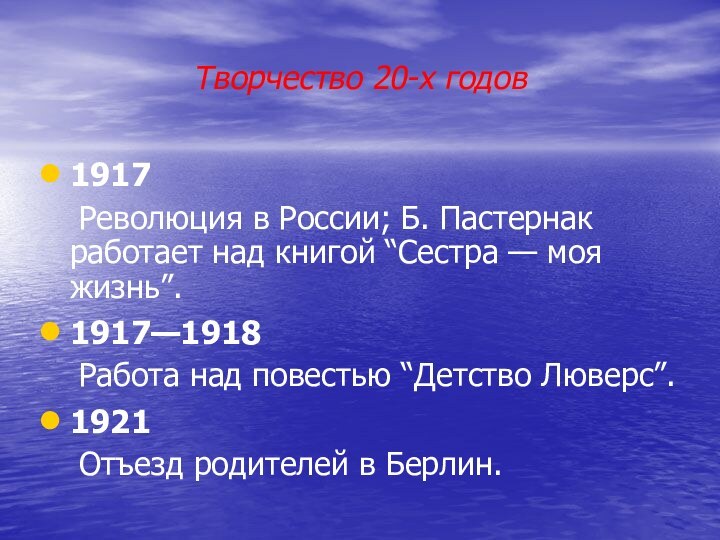 Творчество 20-х годов1917	Революция в России; Б. Пастернак работает над книгой “Сестра