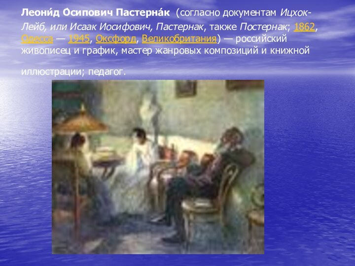 Слайд 5 Леони́д О́сипович Пастерна́к (согласно документам Ицхок-Лейб, или Исаак