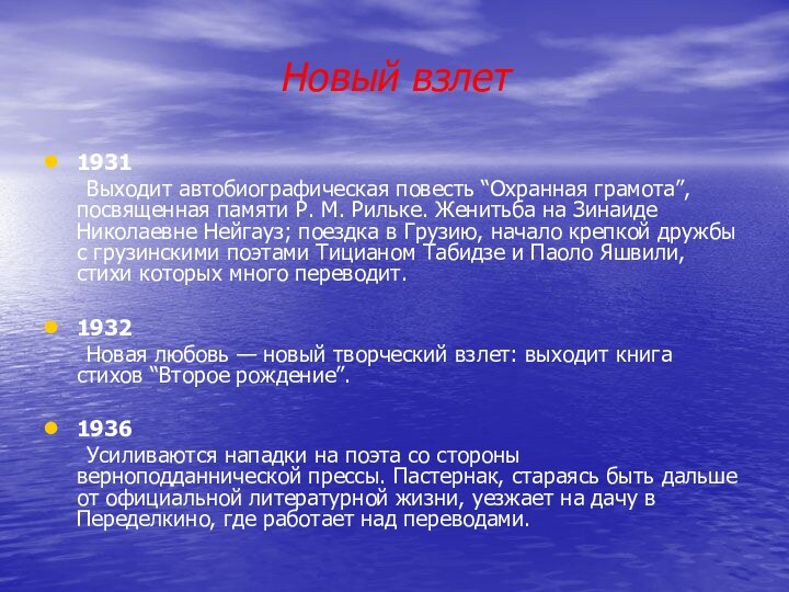 Новый взлет1931	Выходит автобиографическая повесть “Охранная грамота”, посвященная памяти Р. М. Рильке.