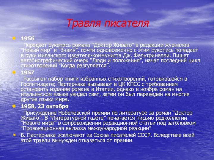 Травля писателя 1956	Передает рукопись романа “Доктор Живаго” в редакции журналов “Новый