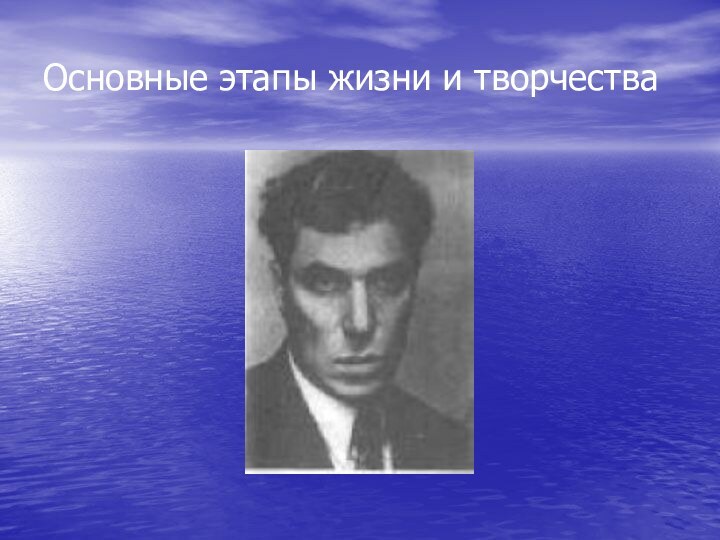 Борис Леонидович Пастернак (1890 – 1960 г.г.)Жизнь и творчество Основные этапы жизни и творчества Эпиграф 	Во всем мне хочется дойти до самой сути:	В работе, в поисках Детство1890, 10 февраля (29 января по ст. ст.)Родился в Москве Б. Пастернак. Леони́д О́сипович Пастерна́к (согласно документам Ицхок-Лейб, или Исаак Иосифович, Пастернак, также Постернак; 1) Лев Толстой с семьей, 1902 год 2) Сосны и море, 1910 год Автопортрет , Л.О.Пастернак с женой Университеты1901, август	Поступил во второй класс московской пятой гимназии.1908, май	Окончание гимназии с золотой 1913 год – решение стать поэтом апрель	Первая публикация стихов Б. Л. Пастернака В кругу футуристов1914	Выходит первый сборник футуристической группы “Центрифуга” — “Руконог” со стихами Творчество 20-х годов1917	Революция в России; Б. Пастернак работает над книгой “Сестра — Творчество 30-х годов1922	Женитьба на художнице Евгении Владимировне Лурье; завязывается переписка Пастернака с Творчество 30-х годов1925—1930	Работа над романом в стихах “Спекторский”, где Пастернак, ощущая тягу Новый взлет1931	Выходит автобиографическая повесть “Охранная грамота”, посвященная памяти Р. М. Рильке. Женитьба Годы войны1941	Переводит и публикует “Гамлета”; начинает работу над переводом “Ромео и Джульетта”.июль—август	Эвакуация В атмосфере репрессий1945—1955	Работа над романом “Доктор Живаго”.октябрь	Знакомится с Ольгой Всеволодовной Ивинской. Б. Пастернак с Ольгой Ивинской Нобелевская премия1946, осень	Первое выдвижение Б. Пастернака на Нобелевскую премию: его кандидатуру предложили Травля писателя 1956	Передает рукопись романа “Доктор Живаго” в редакции журналов “Новый мир” Последние дни поэта1959	В английской газете публикуется стихотворение “Нобелевская премия”, после чего Б. Могила писателя в Переделкино Дом-музей в Переделкино Б. Пастернак