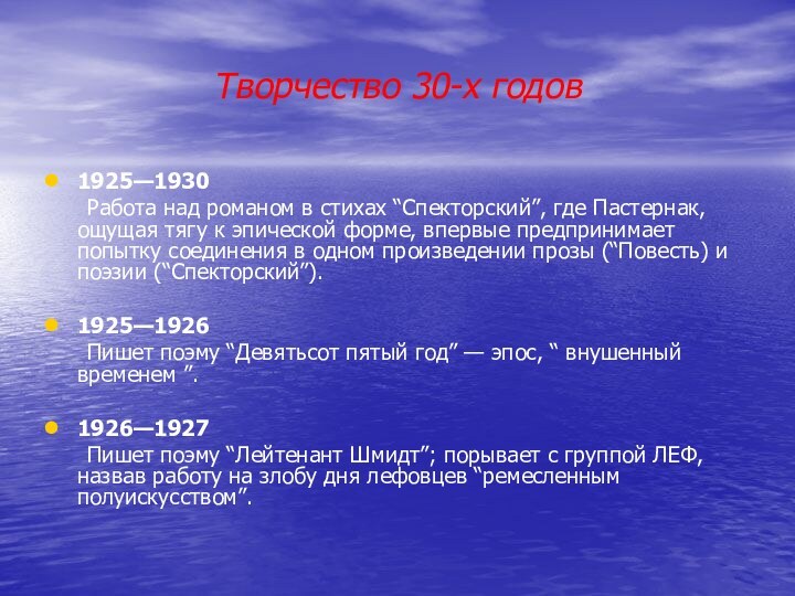 Творчество 30-х годов1925—1930	Работа над романом в стихах “Спекторский”, где Пастернак, ощущая