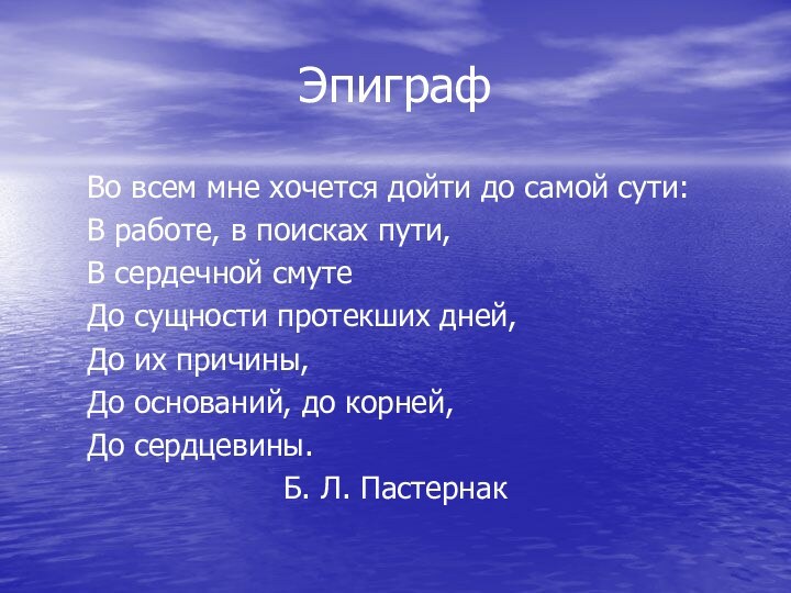 Эпиграф 	Во всем мне хочется дойти до самой сути:	В работе, в