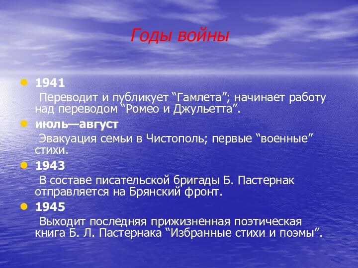 Годы войны1941	Переводит и публикует “Гамлета”; начинает работу над переводом “Ромео и