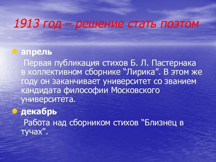 1913 год – решение стать поэтом апрель	Первая публикация стихов Б. Л.