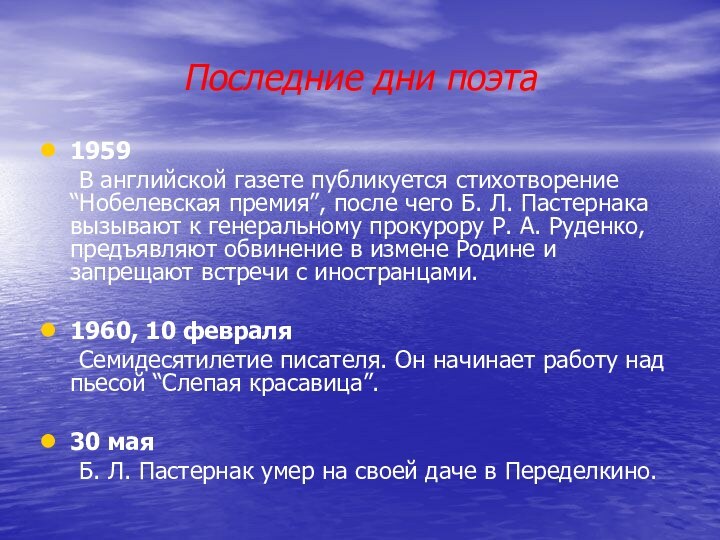 Последние дни поэта1959	В английской газете публикуется стихотворение “Нобелевская премия”, после чего