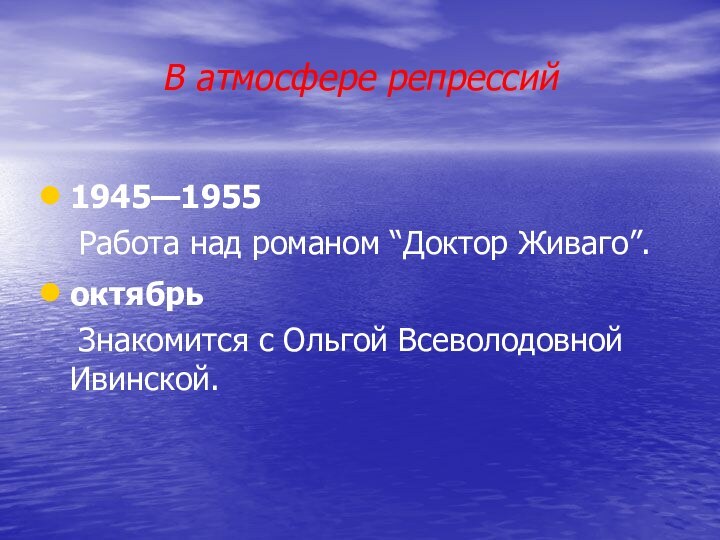 В атмосфере репрессий1945—1955	Работа над романом “Доктор Живаго”.октябрь	Знакомится с Ольгой Всеволодовной Ивинской.
