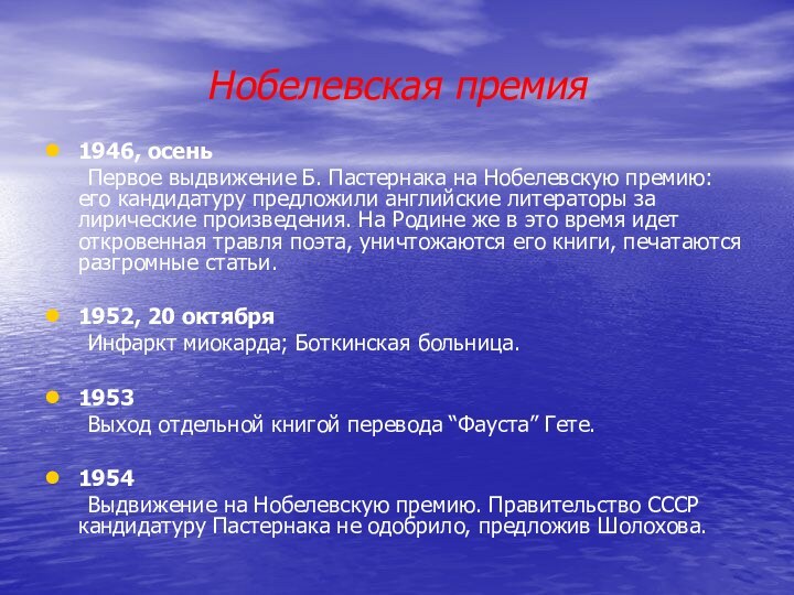 Нобелевская премия1946, осень	Первое выдвижение Б. Пастернака на Нобелевскую премию: его кандидатуру