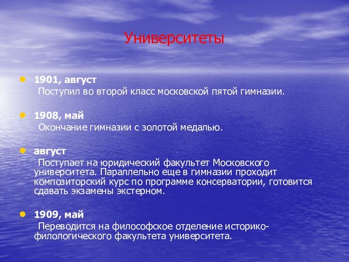 Университеты1901, август	Поступил во второй класс московской пятой гимназии.1908, май	Окончание гимназии с
