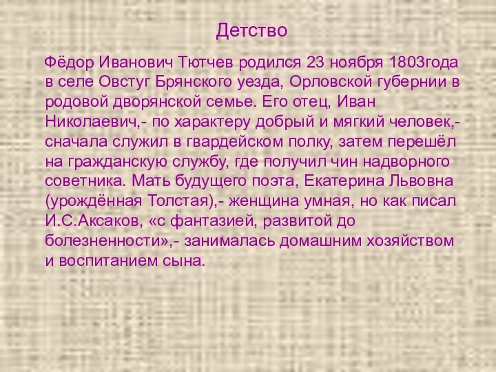 Детство Фёдор Иванович Тютчев родился 23 ноября 1803года в селе Овстуг Брянского уезда, Орловской губернии в родовой дворянской семье. Его отец, Иван Николаевич,- по характеру добрый и мягкий человек,- сначала служил в гвардейском полку,