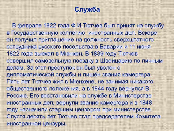 Служба В феврале 1822 года Ф.И.Тютчев был принят на службу в