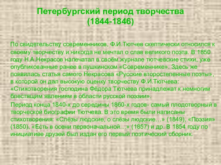 Петербургский период творчества (1844-1846) По свидетельству современников, Ф.И.Тютчев скептически относился к