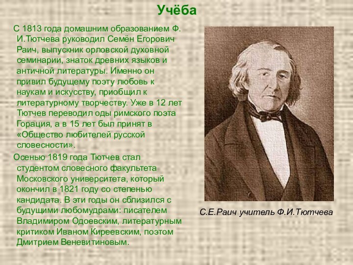 Учёба С 1813 года домашним образованием Ф.И.Тютчева руководил Семён Егорович Раич,
