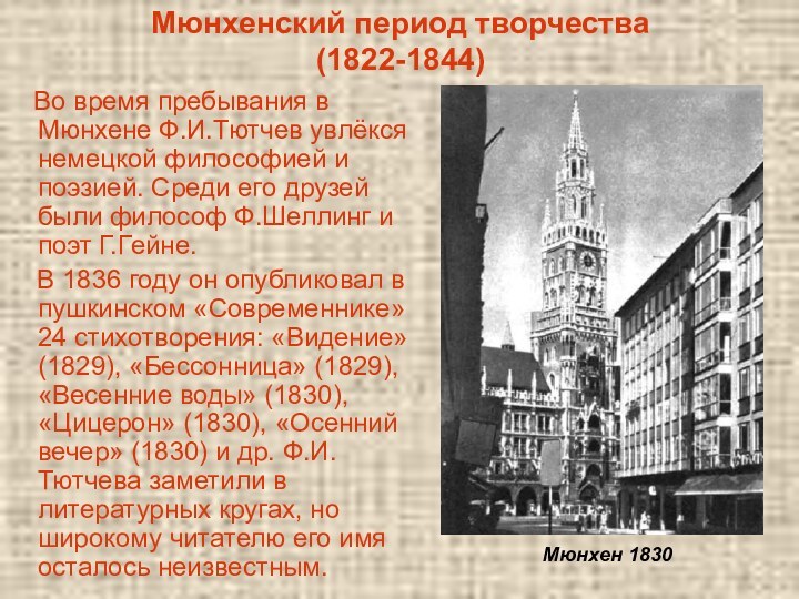 Мюнхенский период творчества (1822-1844) Во время пребывания в Мюнхене Ф.И.Тютчев увлёкся