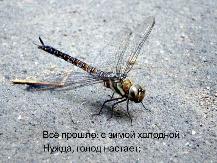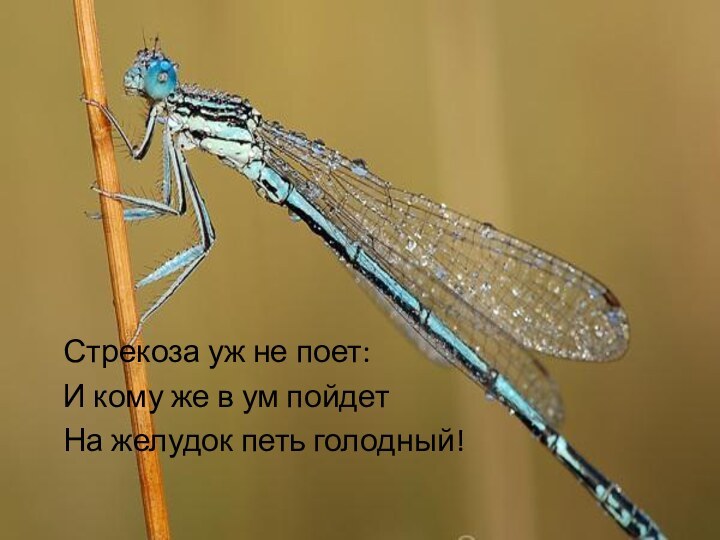 Стрекоза уж не поет: И кому же в ум пойдет На желудок петь голодный!