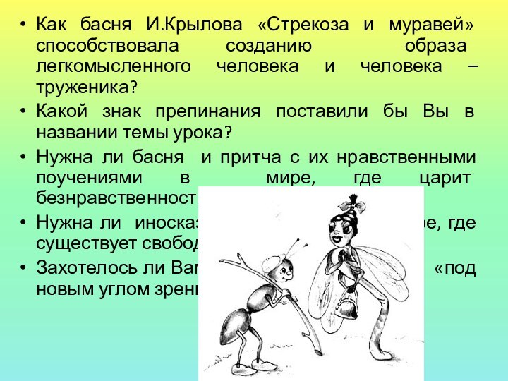 Как басня И.Крылова «Стрекоза и муравей» способствовала созданию образа легкомысленного человека