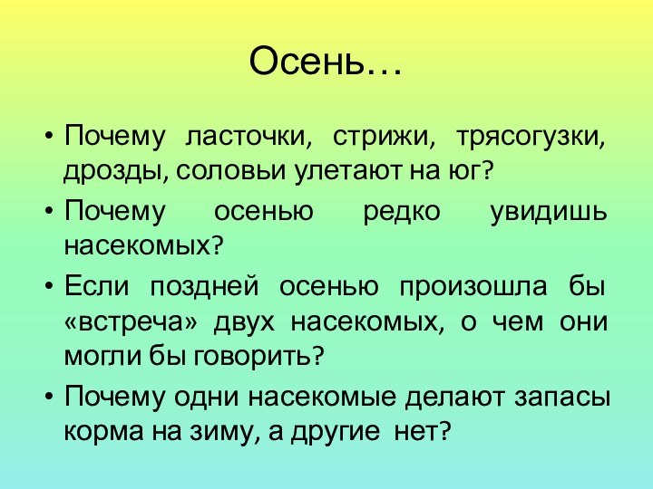 Осень…Почему ласточки, стрижи, трясогузки, дрозды, соловьи улетают на юг?Почему осенью редко
