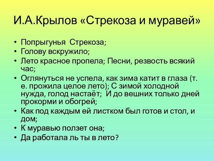 И.А.Крылов «Стрекоза и муравей»Попрыгунья Стрекоза;Голову вскружило;Лето красное пропела; Песни, резвость всякий