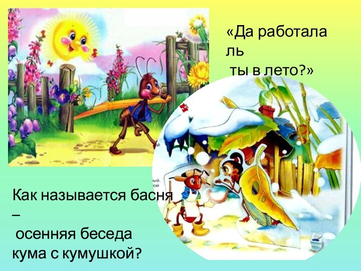 Как называется басня – осенняя беседа кума с кумушкой?«Да работала ль ты в лето?»