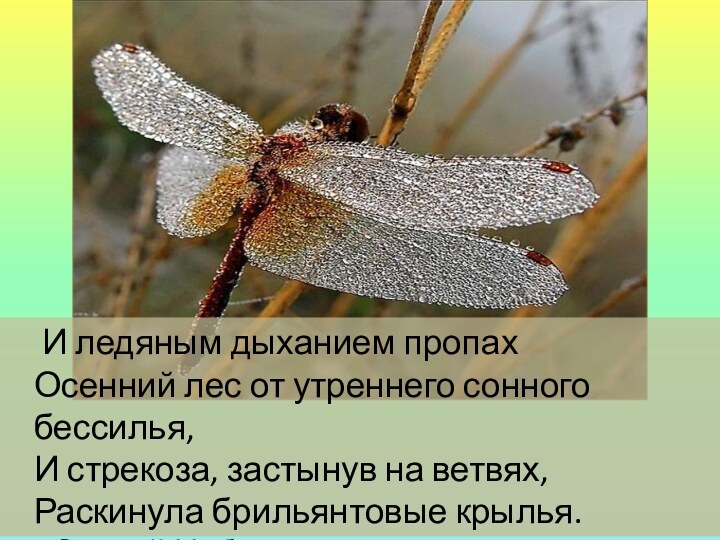 от утреннего сонного бессилья, И стрекоза, застынув на ветвях, Раскинула
