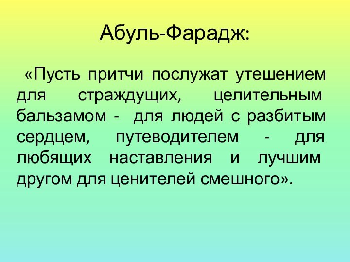 Абуль-Фарадж:  «Пусть притчи послужат утешением для страждущих, целительным бальзамом -