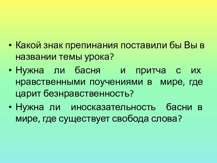 Какой знак препинания поставили бы Вы в названии темы урока?Нужна ли басня и притча с их нравственными поучениями в мире, где царит безнравственность? Нужна ли иносказательность басни в мире, где существует свобода слова?