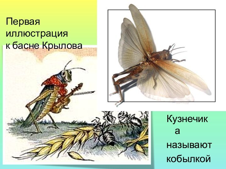 Первая иллюстрация к басне КрыловаКузнечика называют кобылкой.