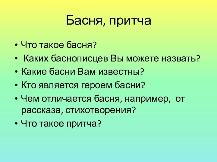 Басня, притчаЧто такое басня?  Каких баснописцев Вы можете назвать? Какие басни
