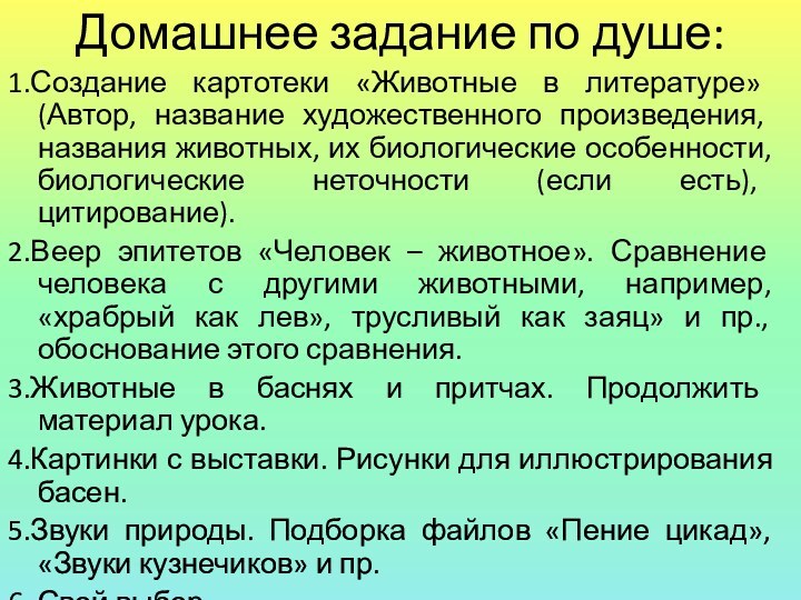 Домашнее задание по душе:1.Создание картотеки «Животные в литературе» (Автор, название художественного