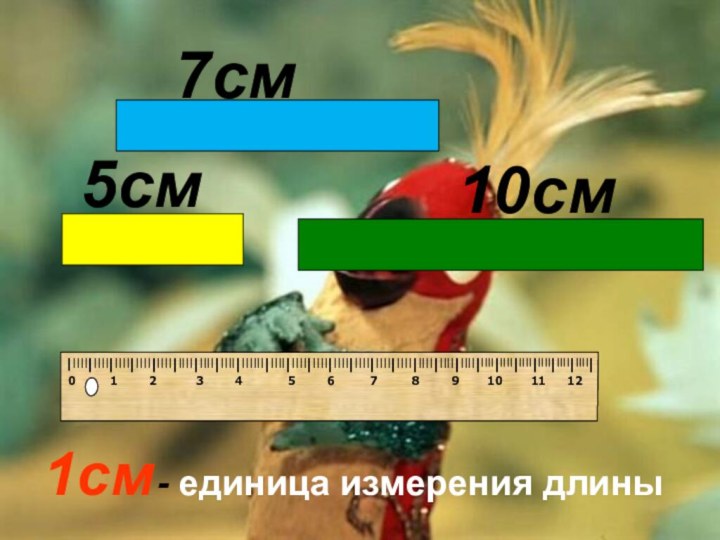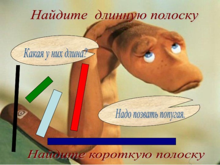 Найдите длинную полоску Найдите короткую полоску Какая у них длина? Надо позвать попугая.