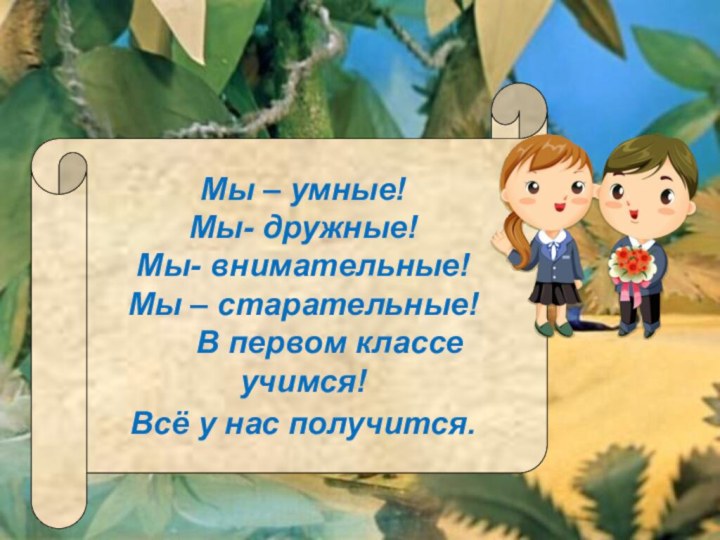 Мы – умные!Мы- дружные!Мы- внимательные!Мы – старательные!  В первом классе учимся!Всё у нас получится.