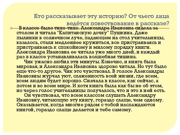 сидела за столом и читала "Капитанскую дочку" Пушкина. Даже пылинки в солнечном луче, падающем на стол учительницы, казалось, стали медленнее кружиться, все пристраиваясь и пристраиваясь к спокойному и милому порядку книги. Александра Ивановна ее читала уже много дней, и каждый раз в классе устанавливалась волшебная тишина.       Чик ужасно любил эти минуты. Конечно, и книга была мировая, и Александра Ивановна здорово читала. Но тут было еще что-то другое. Чик это чувствовал. В голосе Александры Ивановны журчал уют, слаженность всей жизни, где всем, всем людям будет хорошо. Сначала в классе, как сейчас, а потом и во всем мире. И хотя книга была как бы не об этом, но через голос учительницы получалось, что и это в ней есть.       Он чувствовал, что всем классом слушать Александру Ивановну, читающую эту книгу, гораздо слаще, чем одному. Оказывается, когда многие рядом с тобой наслаждаются книгой, гораздо слаще делается и тебе самому.