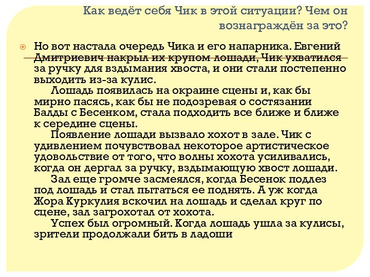 его напарника. Евгений Дмитриевич накрыл их крупом лошади, Чик ухватился за ручку для вздымания хвоста, и они стали постепенно выходить из-за кулис.       Лошадь появилась на окраине сцены и, как бы мирно пасясь, как бы не подозревая о состязании Балды с Бесенком, стала подходить все ближе и ближе к середине сцены.       Появление лошади вызвало хохот в зале. Чик с удивлением почувствовал некоторое артистическое удовольствие от того, что волны хохота усиливались, когда он дергал за ручку, вздымающую хвост лошади.       Зал еще громче засмеялся, когда Бесенок подлез под лошадь и стал пытаться ее поднять. А уж когда Жора Куркулия вскочил на лошадь и сделал круг по сцене, зал загрохотал от хохота.       Успех был огромный. Когда лошадь ушла за кулисы, зрители продолжали бить в ладоши
